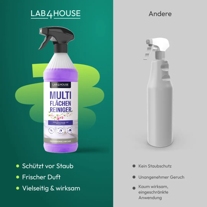 Unser Universalreiniger entfernt effektiv Schmutz, Fett, Staub und andere Verunreinigungen. Seine Wirksamkeit erstreckt sich auch auf Verschmutzungen auf Gartenmöbeln. Haben wir schon erwähnt, dass es sich perfekt für Küchenarbeitsplatten, Haushaltsgeräte, Fußböden, Türen, Fenster und vieles mehr eignet, einschließlich Kunststoffoberflächen? Es ist für verschiedene Oberflächen geeignet, darunter Holz, Laminat, Metall, Kunststoff, Keramik und Glas, was es zu einem universellen Reinigungsmittel für Ihr gesamtes Zuhause macht.